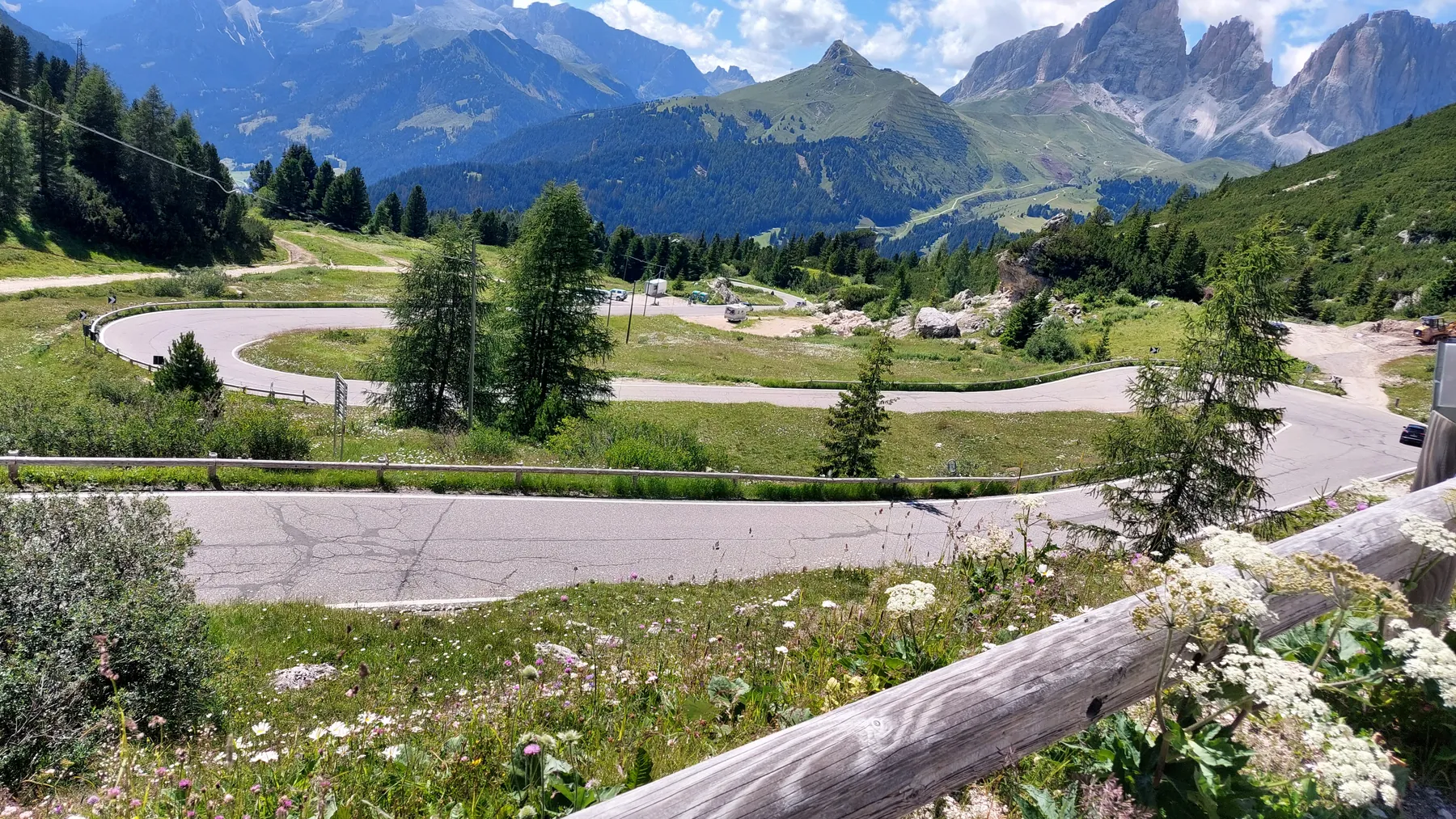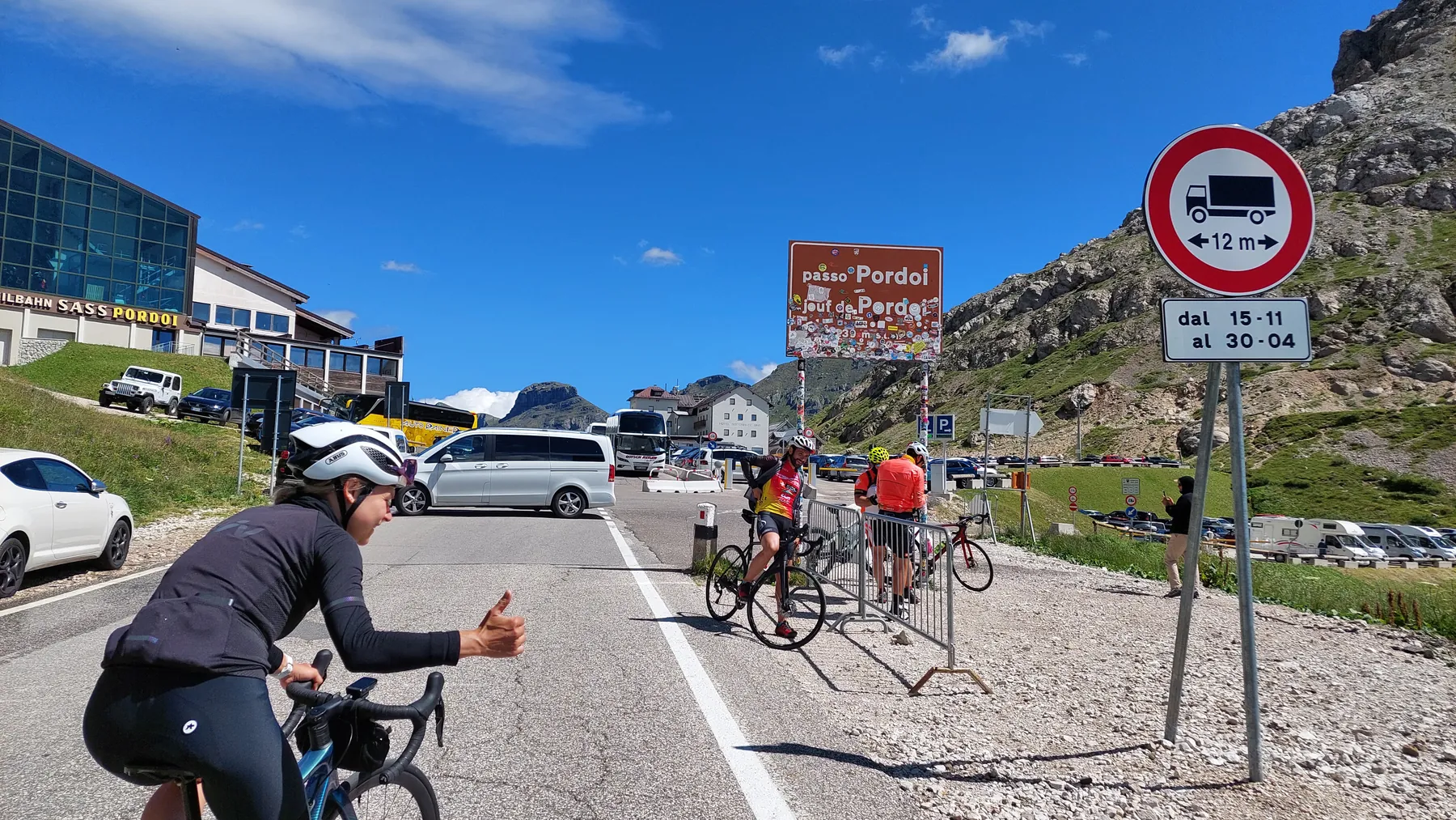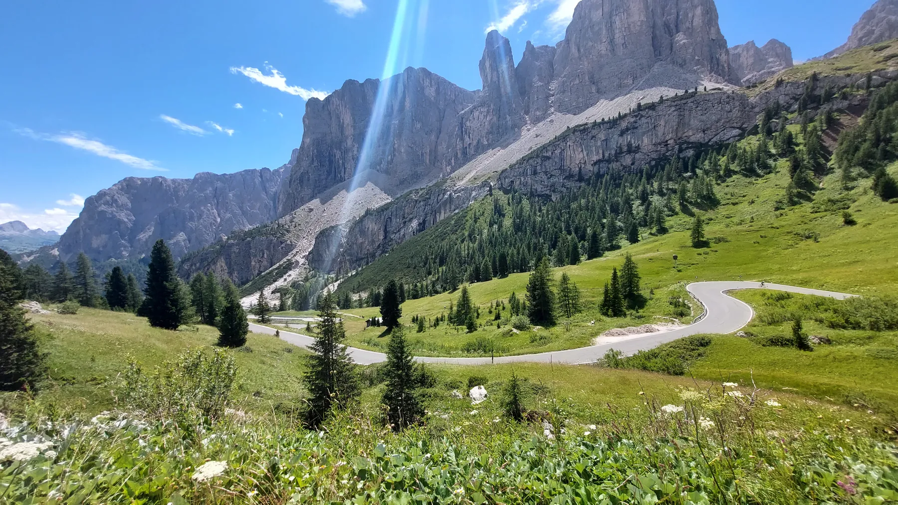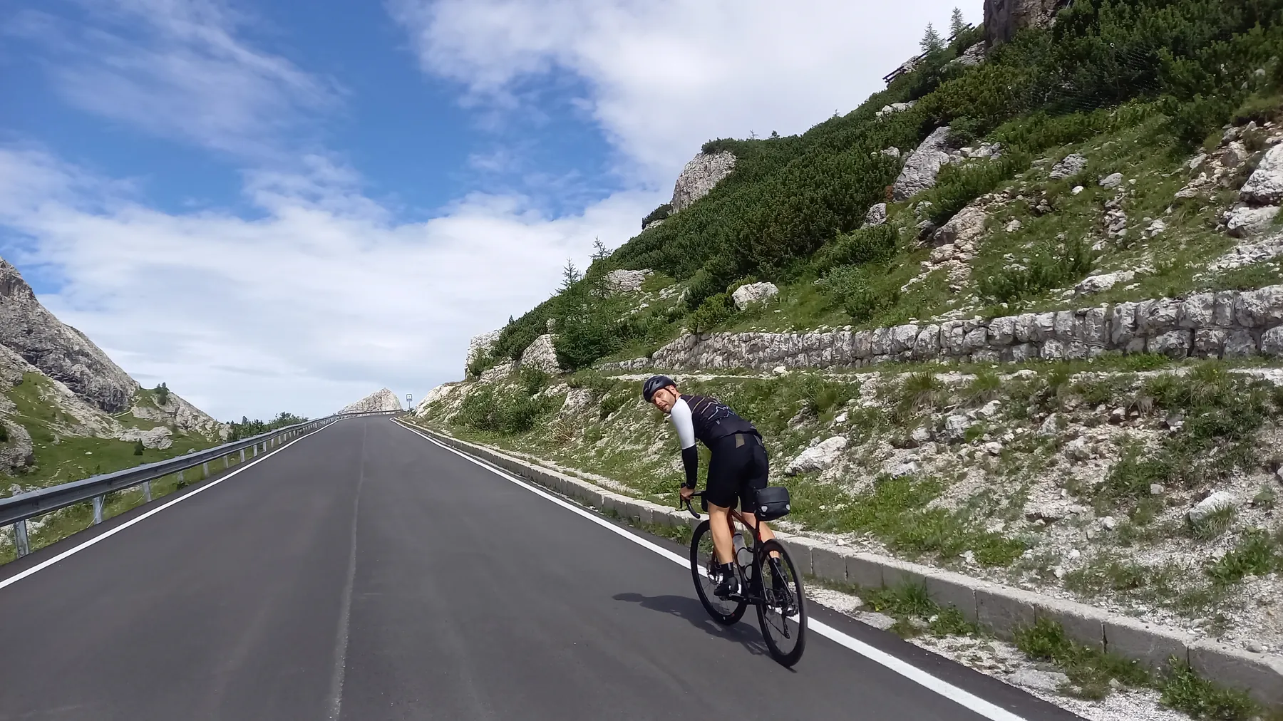 Vom Start weg ging es ans Eingemachte. Es galt die “glorreichen Sieben” zu überwinden: Über den Falzarego und Valparola arbeiteten wir uns hinein in das Herz der bleichen, schroffen Felswände. Die klassische Sella-Runde mit Grödnerjoch, Sellajoch, Pordoi und dem doppelt servierten Campolongo (man gönnt sich ja sonst nichts!) war Fahrspaß pur – Kurvenrausch vor einer Kulisse, die fast schon surreal schön wirkt.