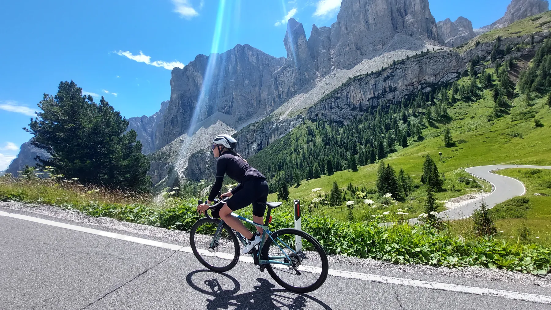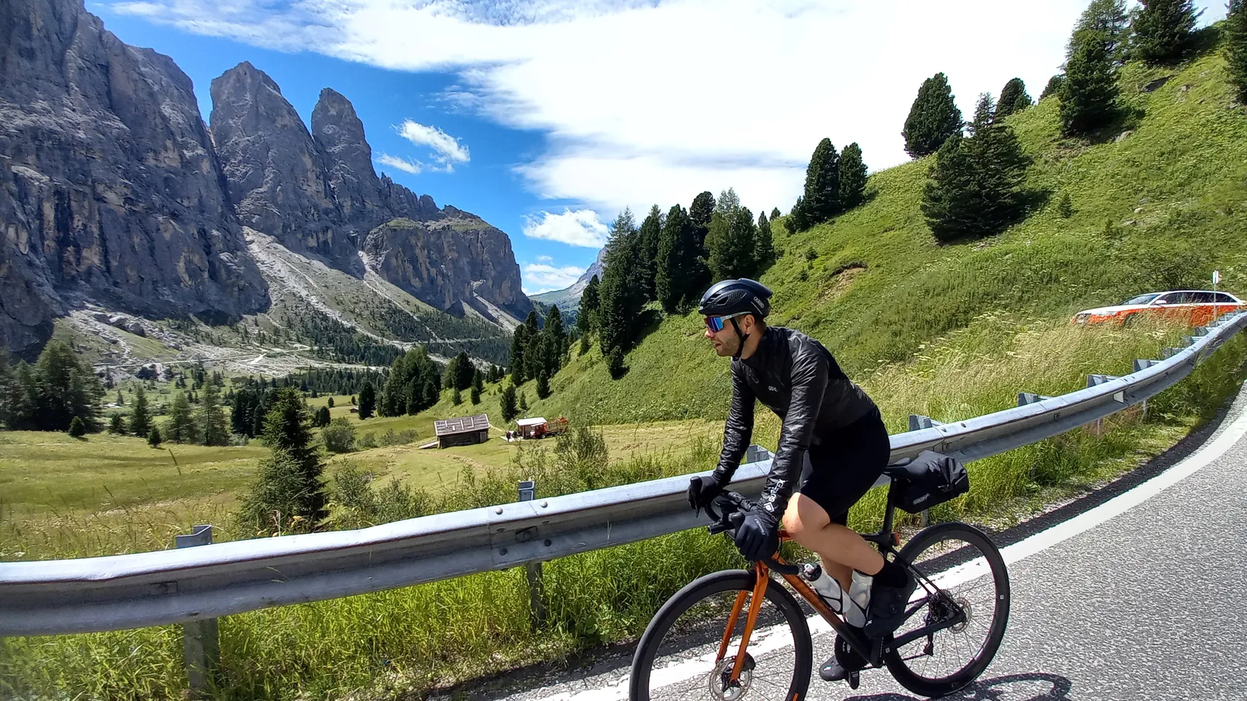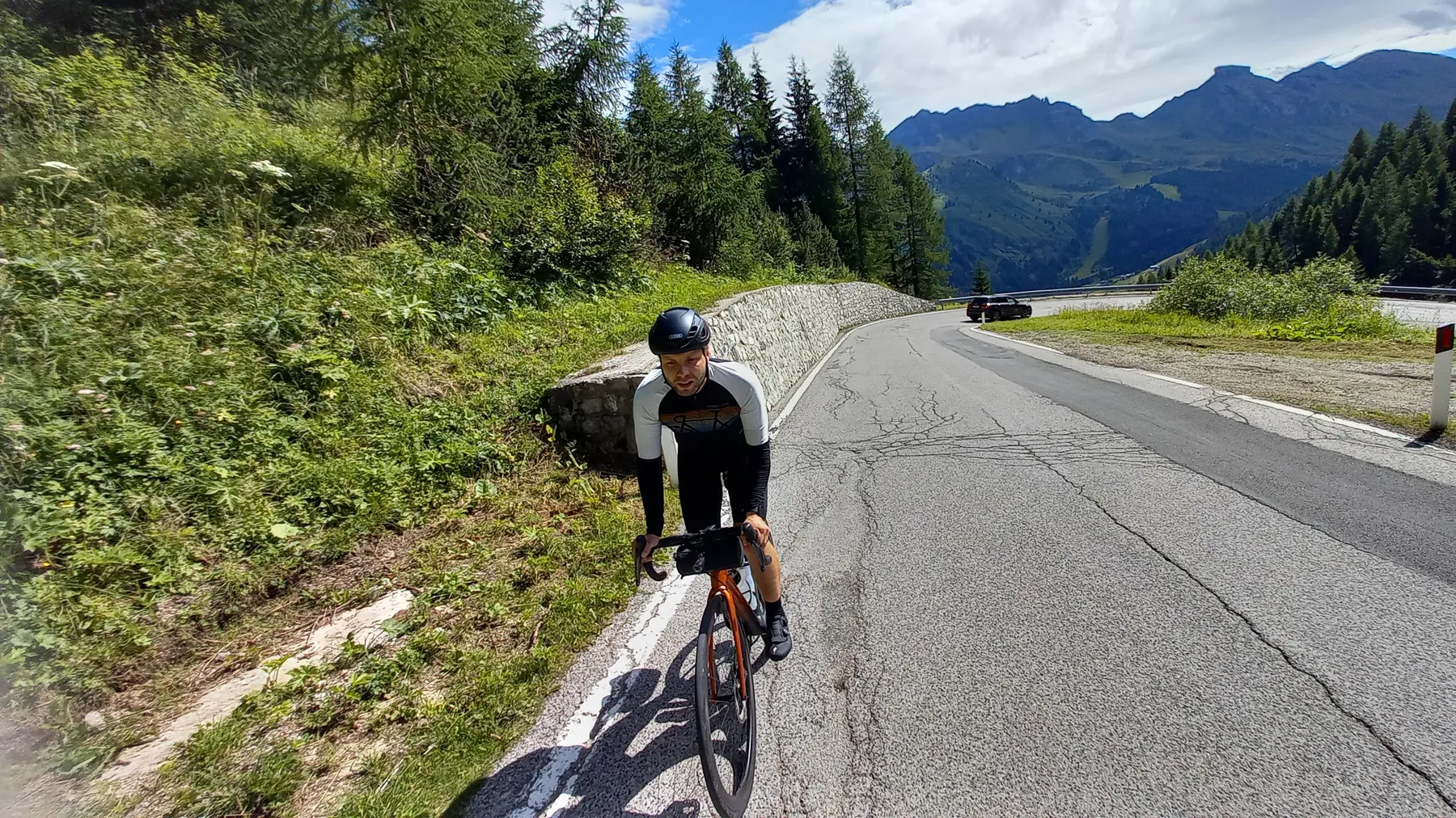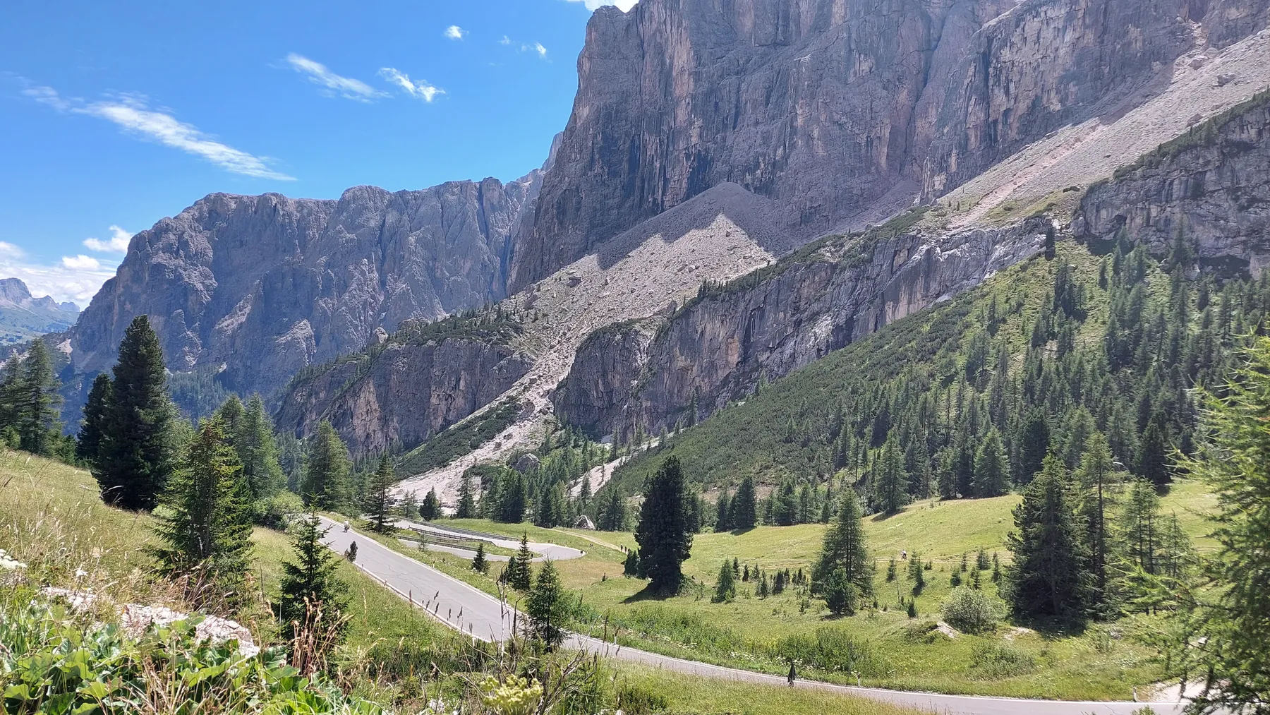 Vom Start weg ging es ans Eingemachte. Es galt die “glorreichen Sieben” zu überwinden: Über den Falzarego und Valparola arbeiteten wir uns hinein in das Herz der bleichen, schroffen Felswände. Die klassische Sella-Runde mit Grödnerjoch, Sellajoch, Pordoi und dem doppelt servierten Campolongo (man gönnt sich ja sonst nichts!) war Fahrspaß pur – Kurvenrausch vor einer Kulisse, die fast schon surreal schön wirkt.