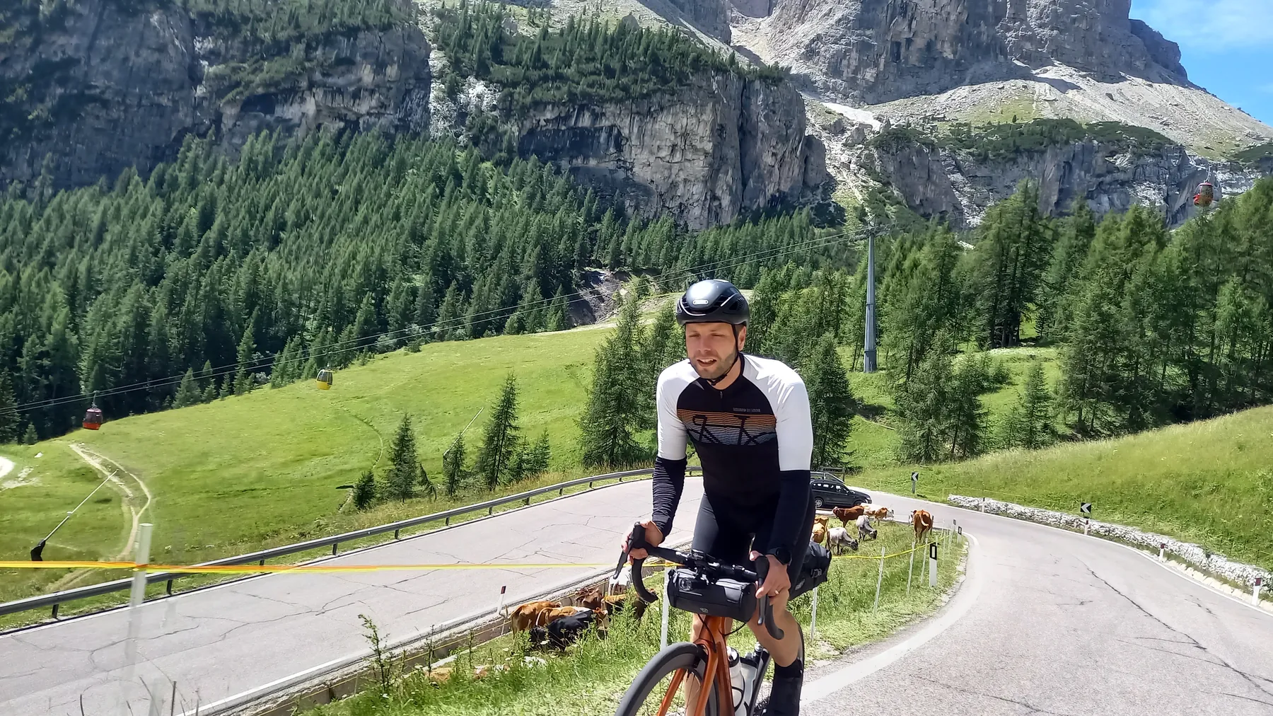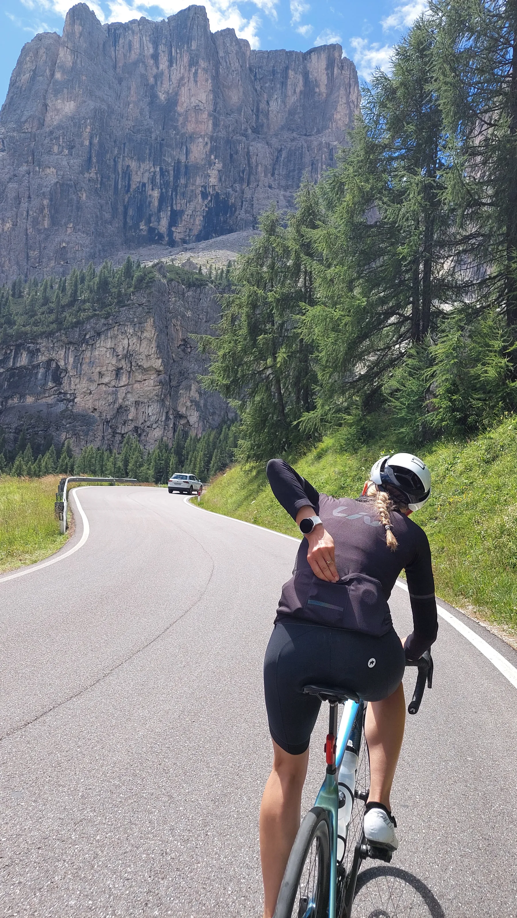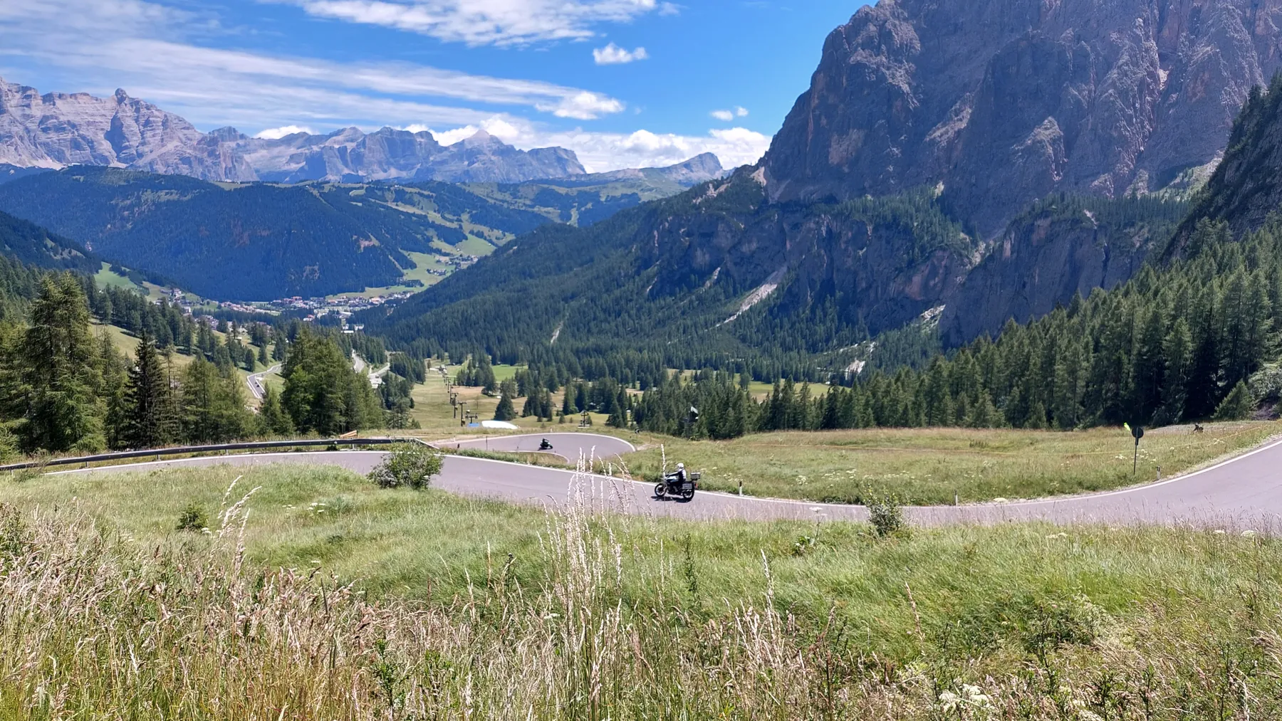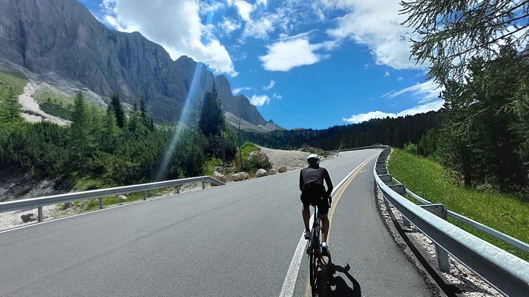 Vom Start weg ging es ans Eingemachte. Es galt die “glorreichen Sieben” zu überwinden: Über den Falzarego und Valparola arbeiteten wir uns hinein in das Herz der bleichen, schroffen Felswände. Die klassische Sella-Runde mit Grödnerjoch, Sellajoch, Pordoi und dem doppelt servierten Campolongo (man gönnt sich ja sonst nichts!) war Fahrspaß pur – Kurvenrausch vor einer Kulisse, die fast schon surreal schön wirkt.