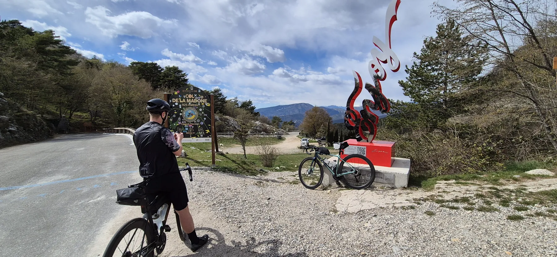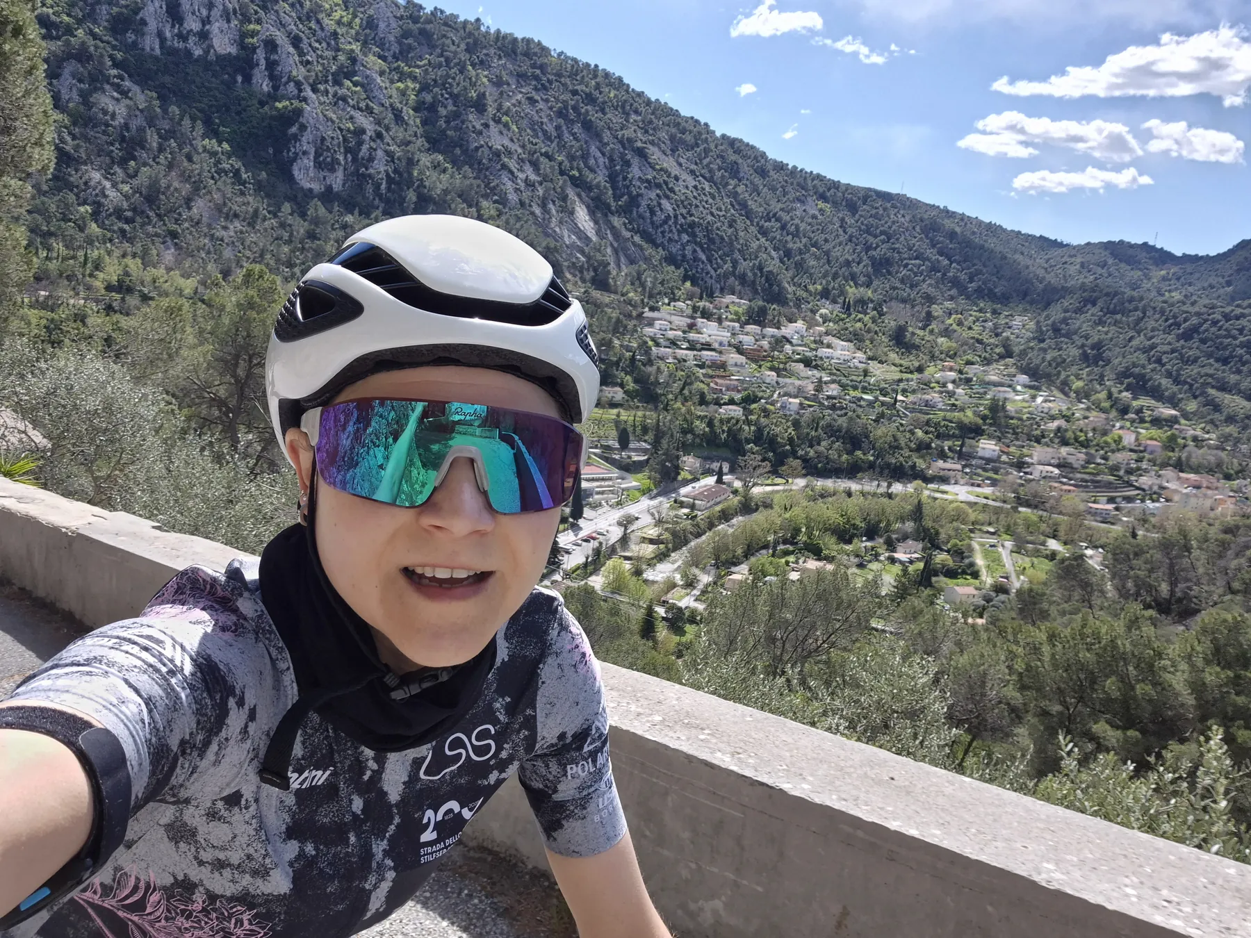 Über Peille arbeiteten wir uns zum Col de Saint-Pancrace vor. Genügend Zeit auch, um schon über den passenden Titel für diesen Blogeintrag abzustimmen. Der Gewinner: “Sieben auf einen Streich”, denn ganze sieben Cols sollten es heute auf dem Tagesmenü sein. (Ja, genau: sollten es sein, aber dazu später mehr…) Und ehe wir uns versahen, steckten wir in der Auffahrt zum legendären Col de la Madone. Dort oben blies ein fieser, schneidender Wind, der jede Körperwärme sofort im Keim erstickte. In der Sonne war es noch mild, doch unter den Wolken fühlte es sich schlagartig 20 Grad kälter an. Sophie mutierte dabei schleichend von der eleganten Bergziege zur leicht grimmigen Kröte im Energiesparmodus – Kälte ist und bleibt ihr persönlicher Endgegner. Fabi hingegen führte einen einsamen Kleiderkrieg: „Zu warm? Zu kalt? Weste an oder aus?“ – eine finale Antwort wurde bis zum Gipfel nicht gefunden.