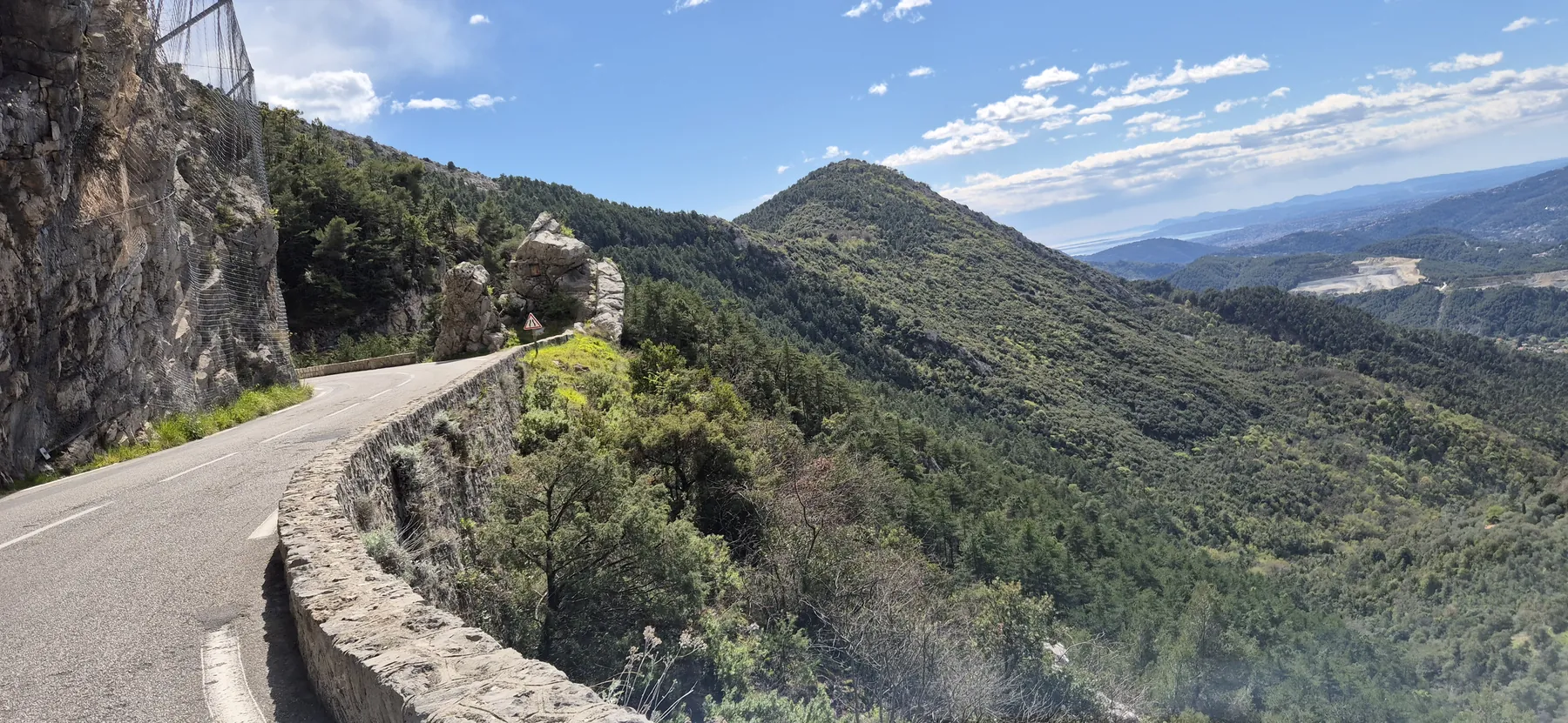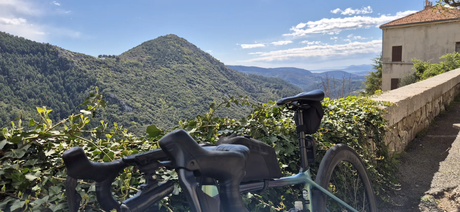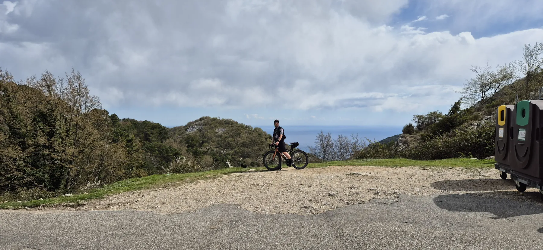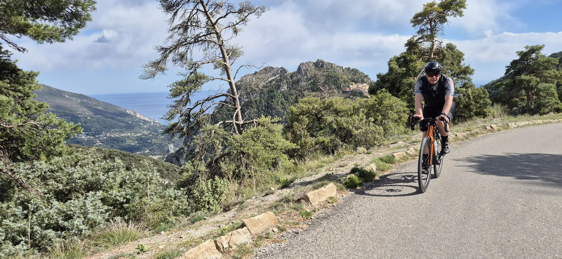 Vom Col de la Madone ging es weiter Richtung Sainte-Agnès, wo uns die vielleicht schönste Passage des Tages erwartete: der Weg zum Col des Banquettes. Eine echte Balkonstraße. Tief unten die Schlucht, ringsherum sattgrüne Hänge und in der Ferne das glitzernde Mittelmeer. Das sind Momente, die kein Foto der Welt adäquat einfangen kann; man muss sie mit den eigenen Beinen erstrampelt haben, um die volle Wirkung zu spüren. Auch die Abfahrt nach L’Escarène war ein verstecktes Meisterwerk: schmal, etwas holprig, aber völlig verlassen und fast schon verwunschen. Ein Ort, an dem man sich fragt: „Warum kennt das eigentlich niemand?!“ Fest steht: Das fahren wir nochmal. Aber dann bergauf!