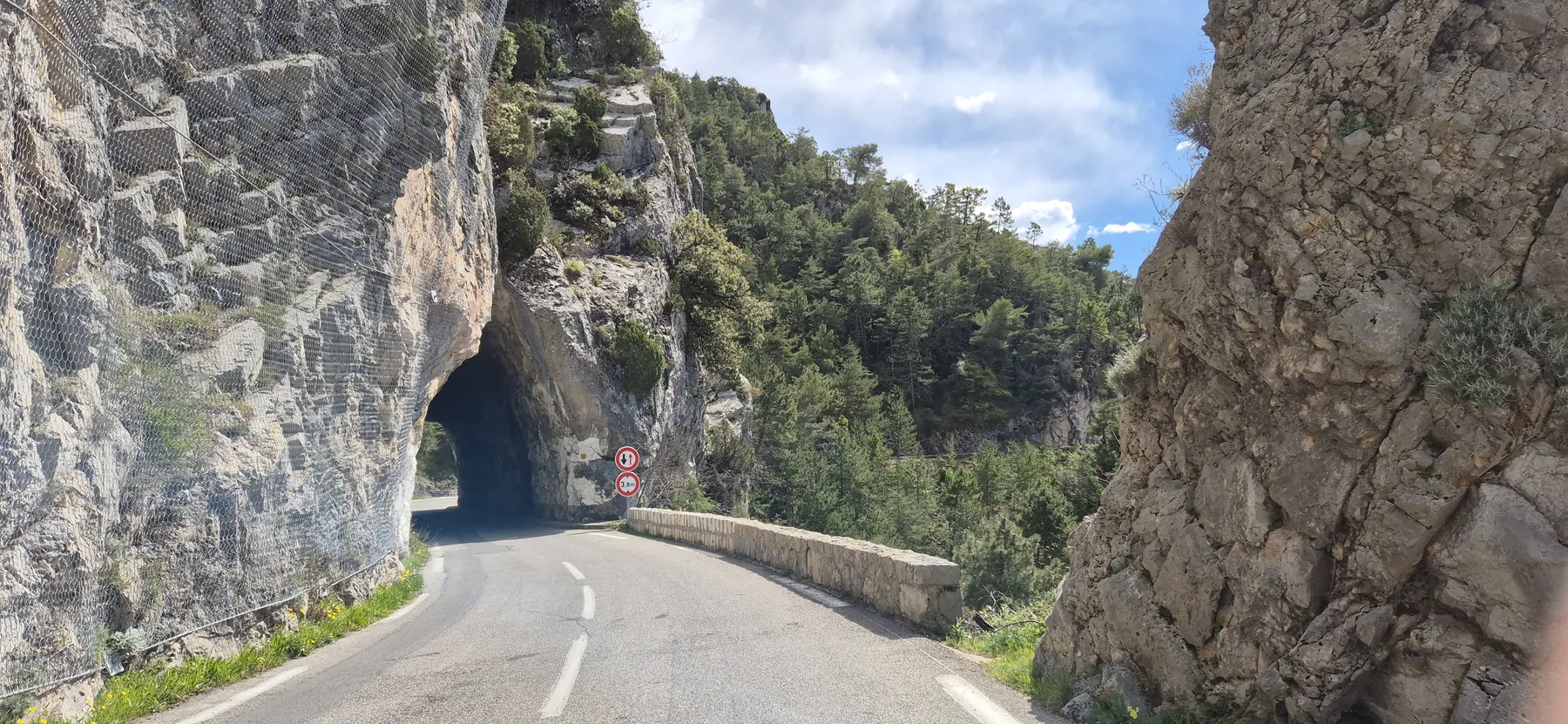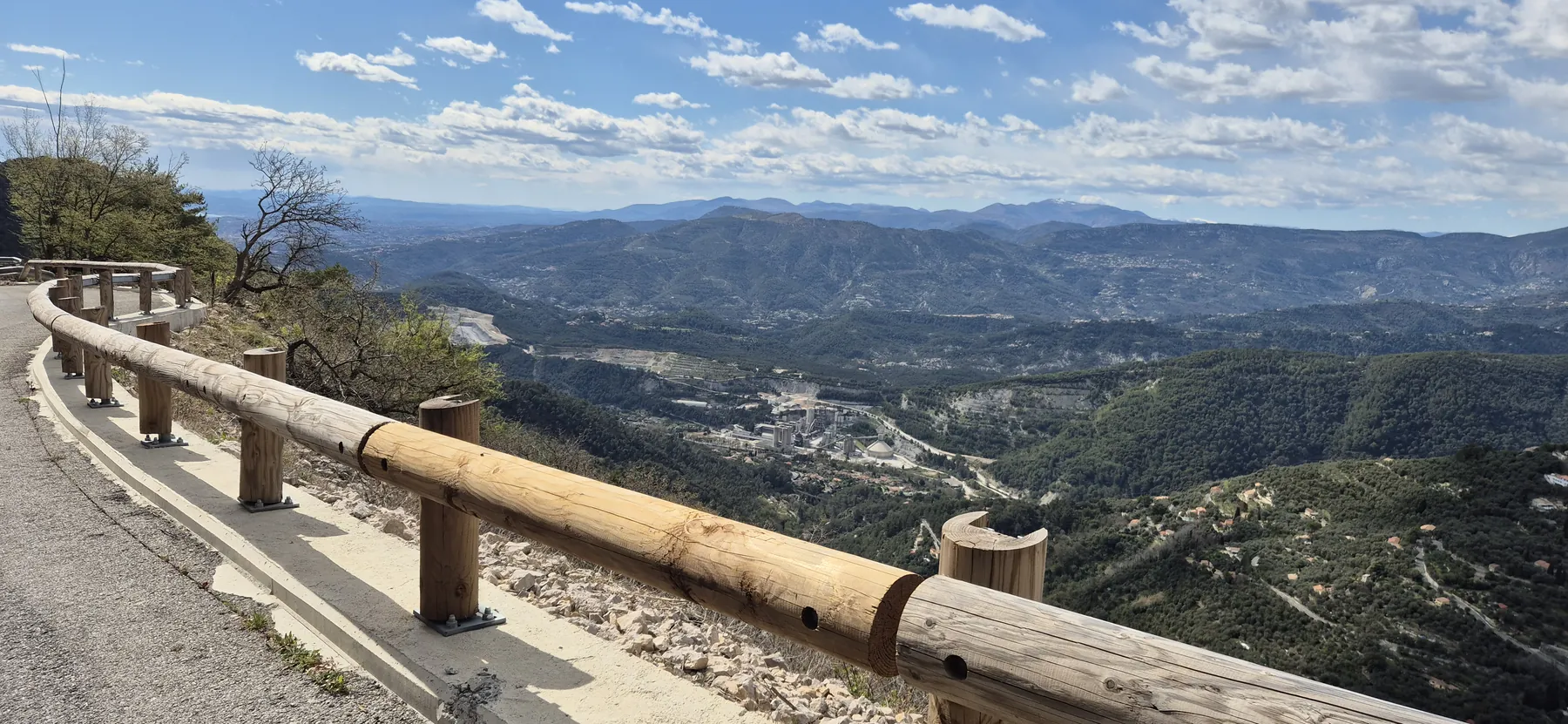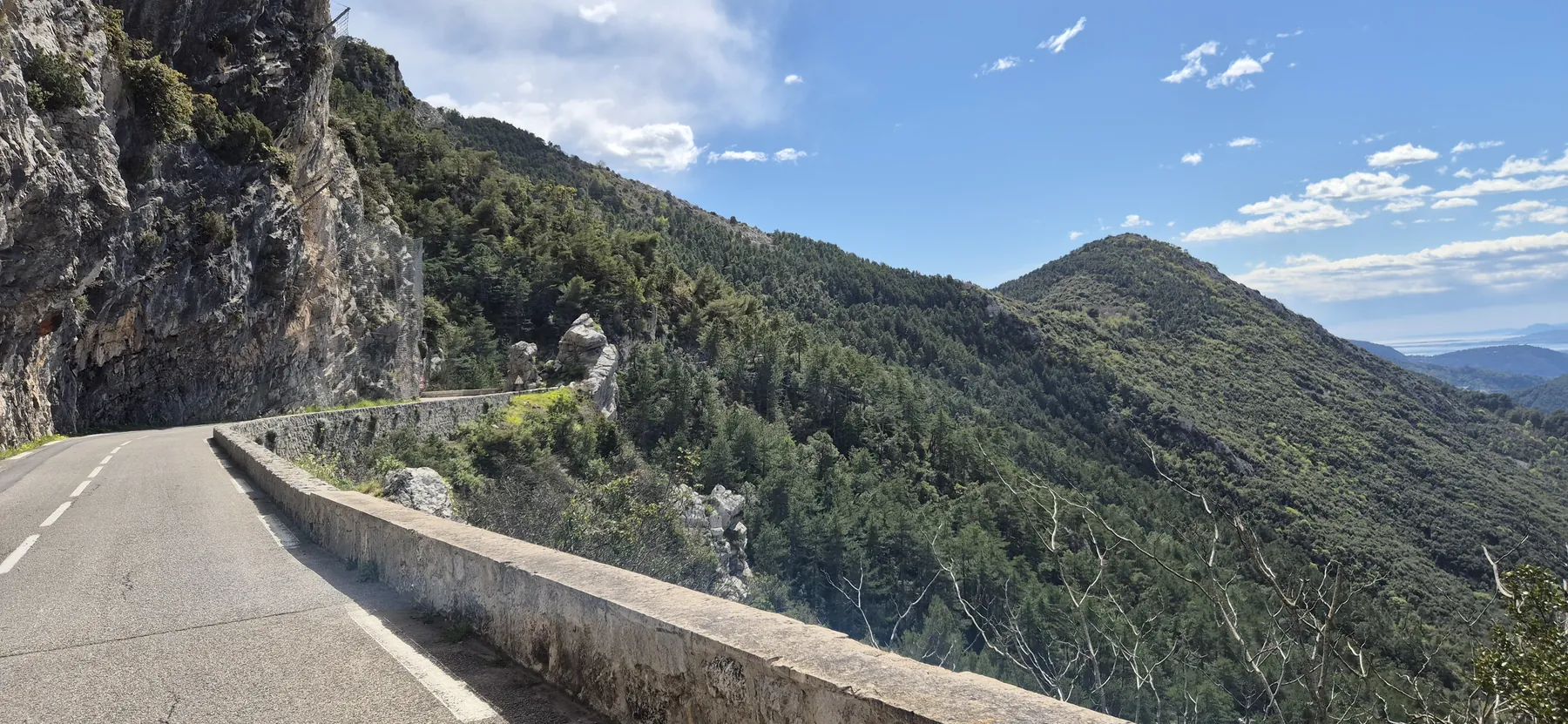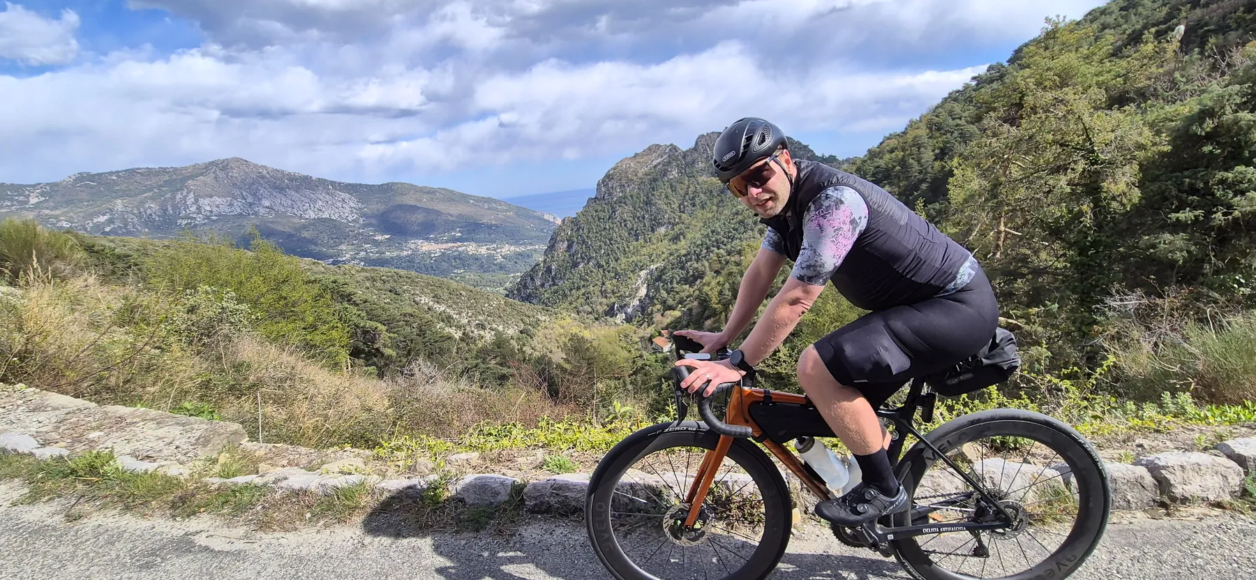 Vom Col de la Madone ging es weiter Richtung Sainte-Agnès, wo uns die vielleicht schönste Passage des Tages erwartete: der Weg zum Col des Banquettes. Eine echte Balkonstraße. Tief unten die Schlucht, ringsherum sattgrüne Hänge und in der Ferne das glitzernde Mittelmeer. Das sind Momente, die kein Foto der Welt adäquat einfangen kann; man muss sie mit den eigenen Beinen erstrampelt haben, um die volle Wirkung zu spüren. Auch die Abfahrt nach L’Escarène war ein verstecktes Meisterwerk: schmal, etwas holprig, aber völlig verlassen und fast schon verwunschen. Ein Ort, an dem man sich fragt: „Warum kennt das eigentlich niemand?!“ Fest steht: Das fahren wir nochmal. Aber dann bergauf!