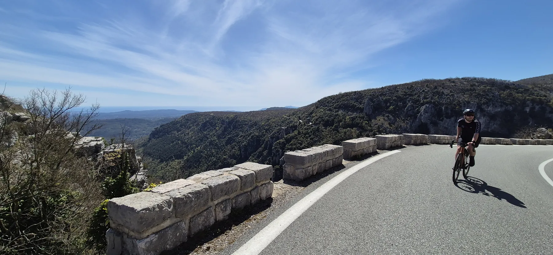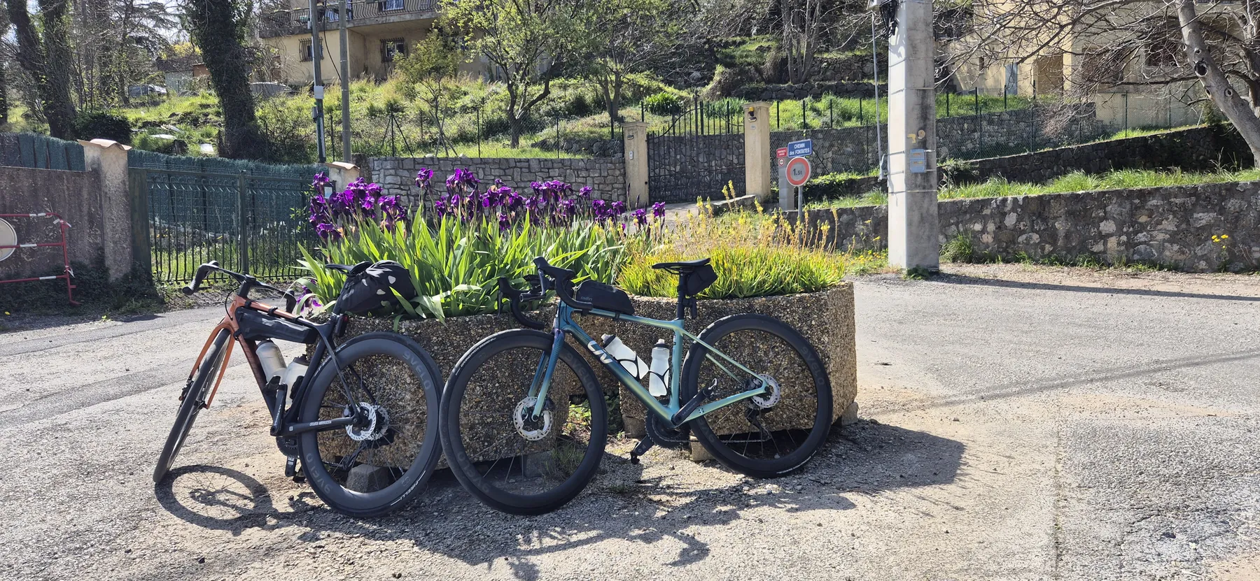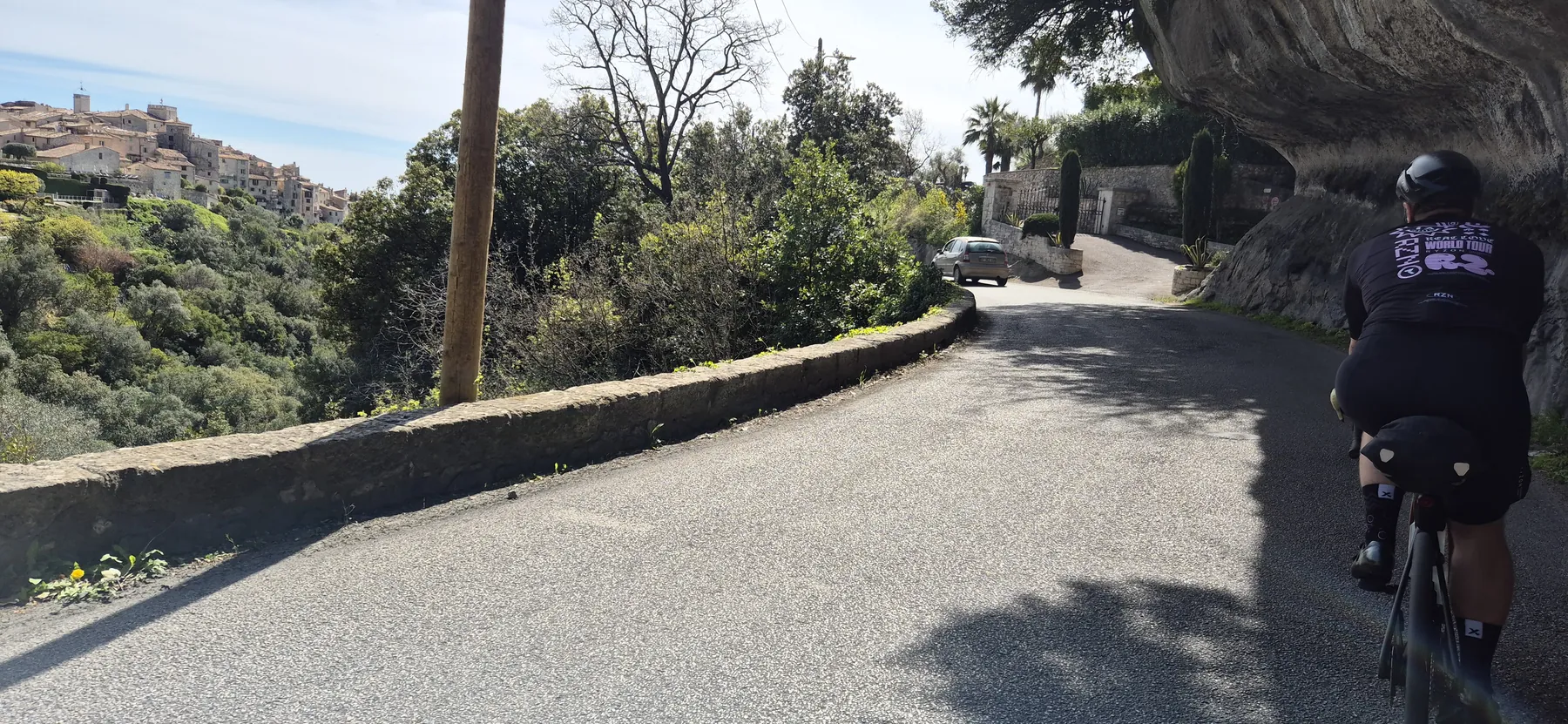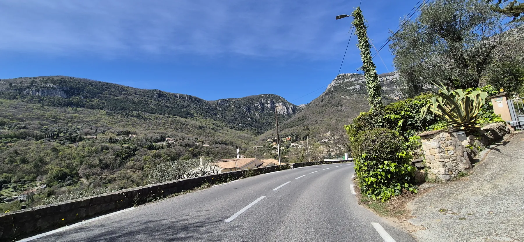 Richtig spannend wurde es bei der Jagd nach der V65, der Var-Küstenradroute. Die Idee einer stillgelegten Bahntrasse klingt nach purer Idylle, entpuppte sich aber als bockiges Labyrinth. Wir sind mit so viel Karacho an den versteckten Abzweigungen vorbeigeprescht, dass wir uns im Fünf-Minuten-Takt fluchend auf der Hauptstraße wiederfanden. Nach dem dritten unfreiwilligen Loop haben wir das Projekt V65 vertagt und stattdessen die Gorges du Loup ins Visier genommen. Eine bombastische Kulisse aus zerklüfteten Felsen und tiefen Schluchten! Das Etappenziel Gourdon ist zwar bildhübsch, aber so dermaßen auf Touristen getrimmt, dass man sich fast wie Requisiten im Freilichtmuseum vorkommt. So haben wir uns heute den Trubel des Stadtkerns geschenkt und sind lieber direkt unterhalb vorbeigedonnert.
