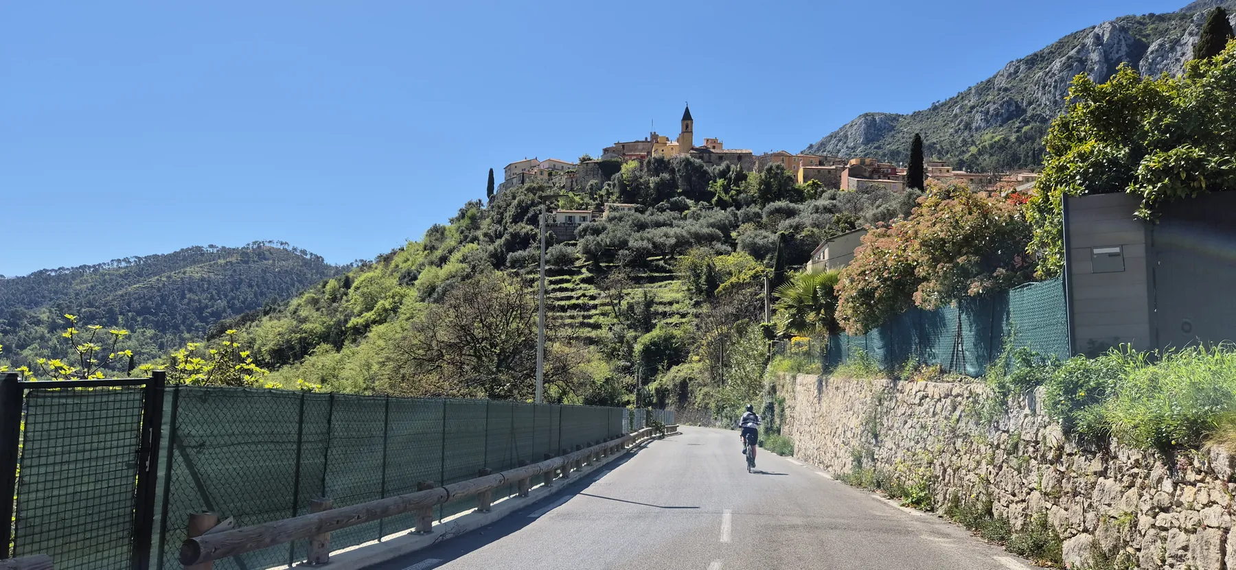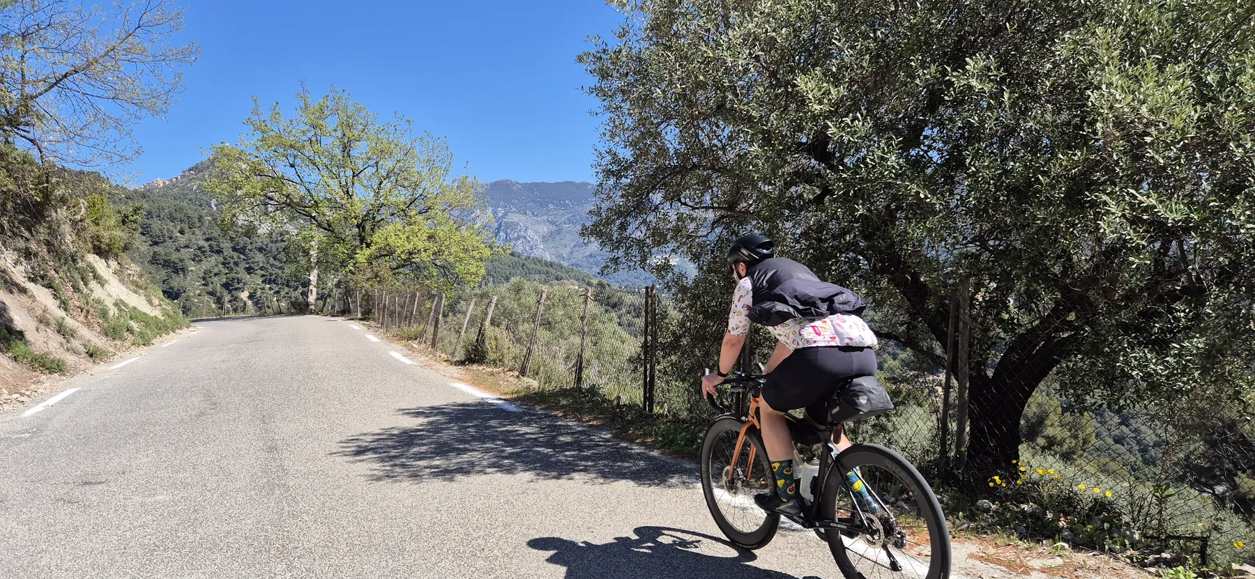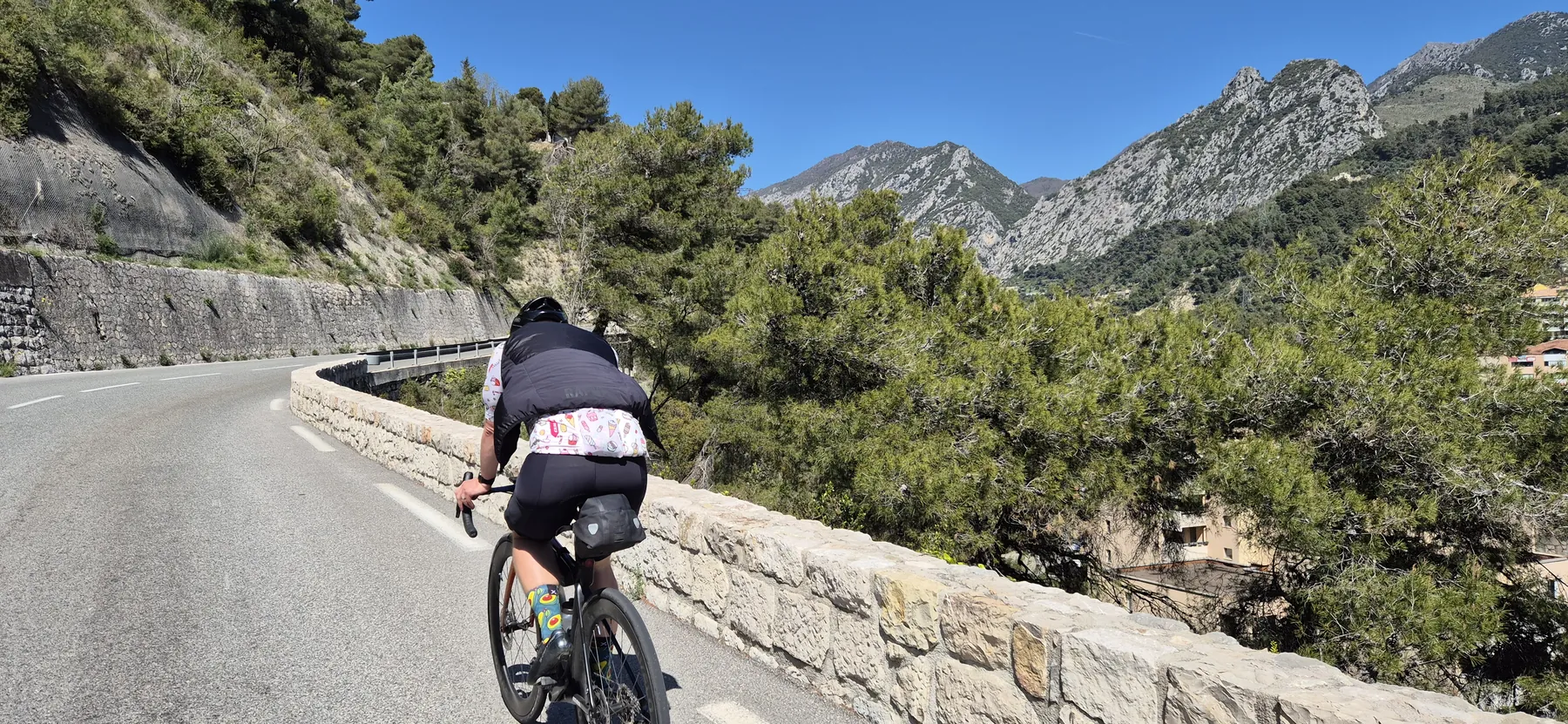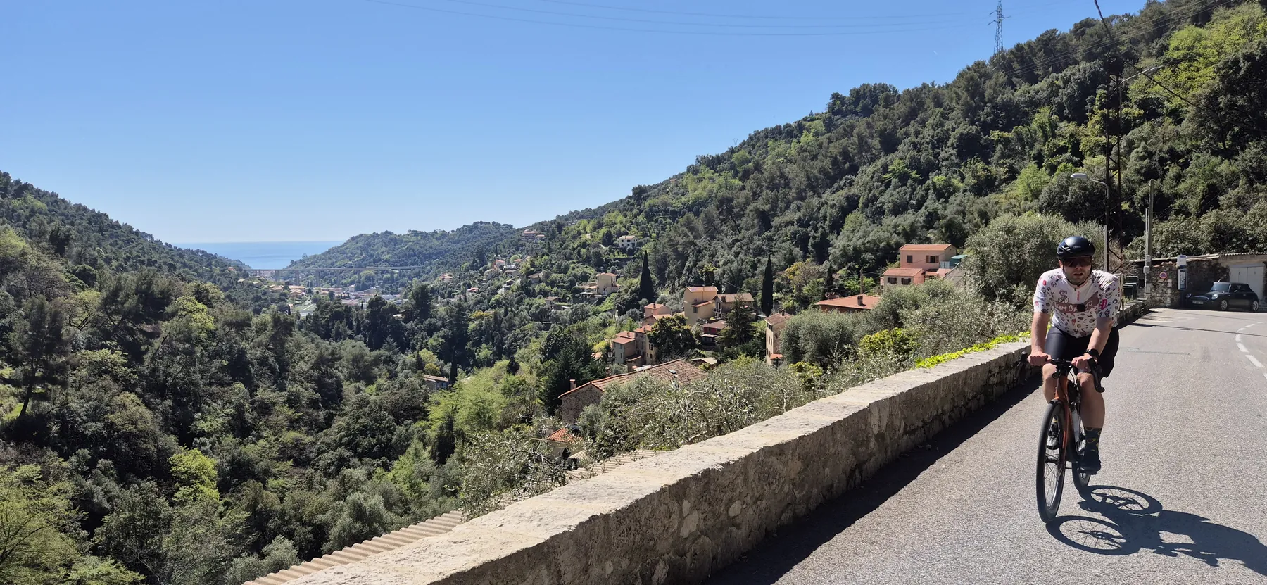 Die Region hier ist nicht umsonst das Mekka für Radsportler:innen. Heute hatten wir fast schon das Gefühl, Teil des Pelotons zu sein: Erst sind wir an einigen echten Profis vorbeigeschossen (oder sie an uns?), und wenig später kam uns auch noch der Mercan’tour Madone-Peille Granfondo entgegen. Die Atmosphäre war elektrisierend!