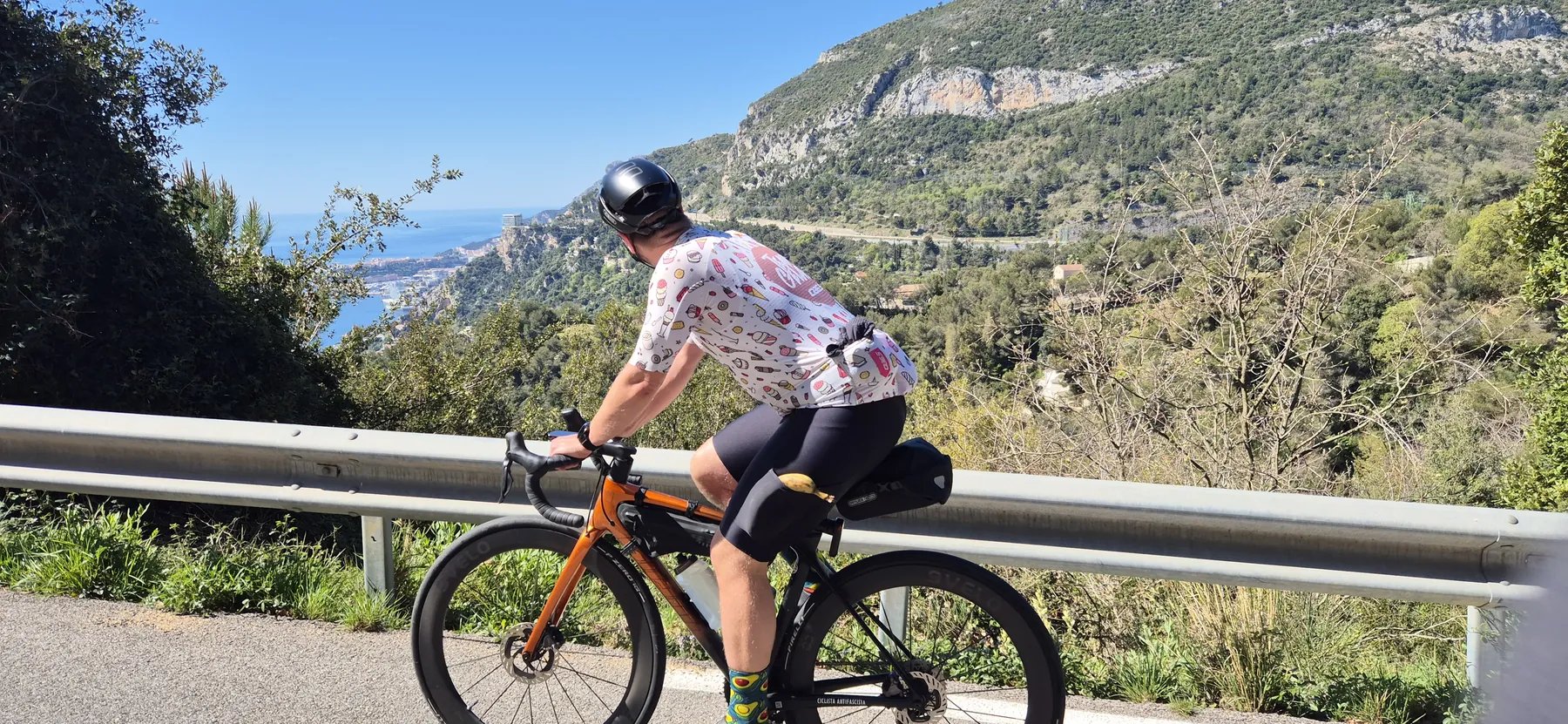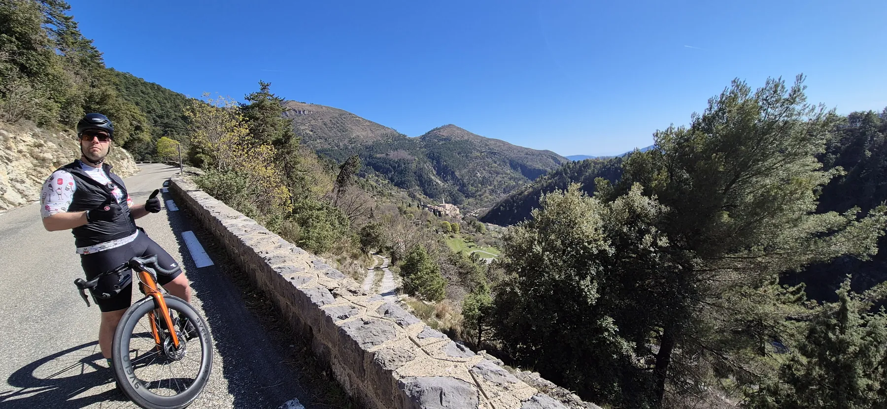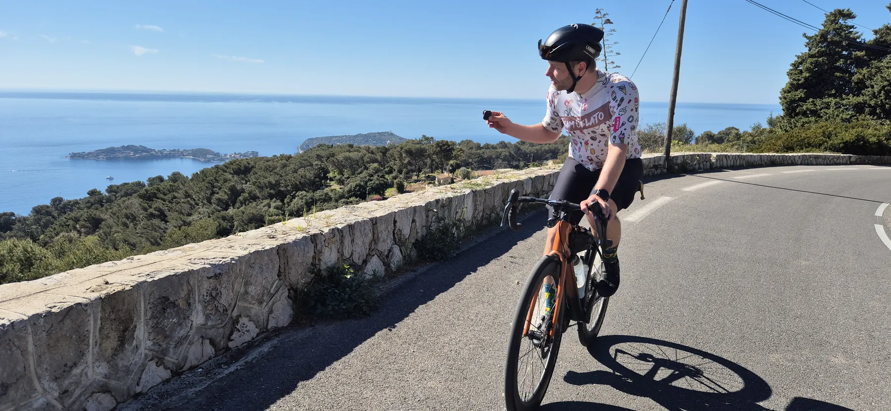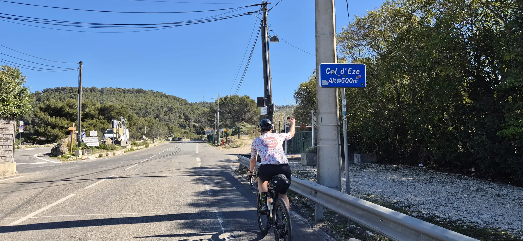 Die Region hier ist nicht umsonst das Mekka für Radsportler:innen. Heute hatten wir fast schon das Gefühl, Teil des Pelotons zu sein: Erst sind wir an einigen echten Profis vorbeigeschossen (oder sie an uns?), und wenig später kam uns auch noch der Mercan’tour Madone-Peille Granfondo entgegen. Die Atmosphäre war elektrisierend!